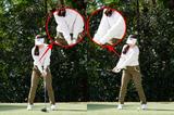 まずは画像Aをご覧ください。左手をややかぶせて握るストロンググリップで、左腕とクラブが一直線になるように構えています。両ひざの間隔とひざの向きに注目してみると、画像Aの右、トップの位置で左ひざはあまり内側に入っていません。これはアドレスで両ひざの向きが内向きにならずにやや外側を向いているから。