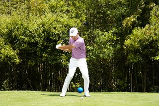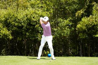 画像A:バックスウィングでは左肩が少し下がり、前傾角をキープしたままトップ位置へクラブが上がる(写真は2021年の関西オープン 写真/岡沢裕行)