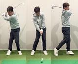 注目したいのは、上半身に対して下半身が先行しながら、胸が右を向いたままクラブが下りているところ。これこそが、力を逃がすことなく、ボールをインサイドからとらえられる形なのです。