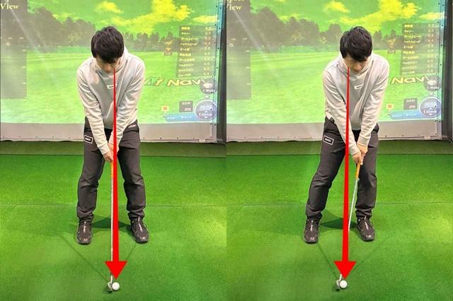 写真B:スタンスの中心にあるボールを「ほんの少し左足重心」で「上からボールを見下ろす」感覚で構えたい場合、同じ意識でも構えは大きく変わる(写真左が左目、右が右目が利き目の場合)