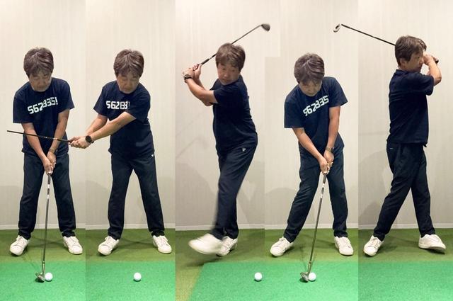 (左)背中を押されている気持ちで振ってみる。(右)前傾角がキープできないと手元が浮いてフェースが右を向いてしまう