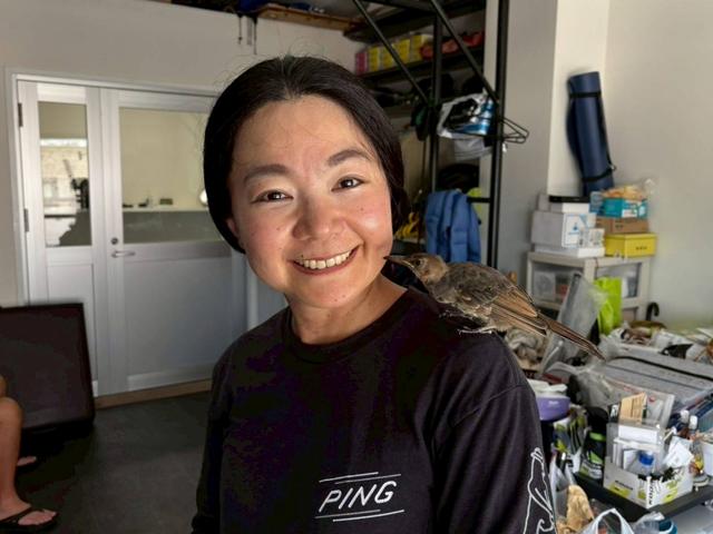 ヒヨドリとたわむれる彩子。満面の笑みを浮かべる。「姉の事務所兼トレーニング場所です。肩に乗っているのがピーちゃんです。かわいいでしょ」