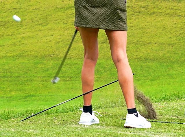アライメントスティックを両脚に挟んでショット練習する原英莉花