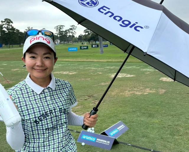 画像: ミッションヒルズの練習場でも、エナジックのロゴ入り傘とボトルを使用。「私もエコ型プロゴルファー目指しています」