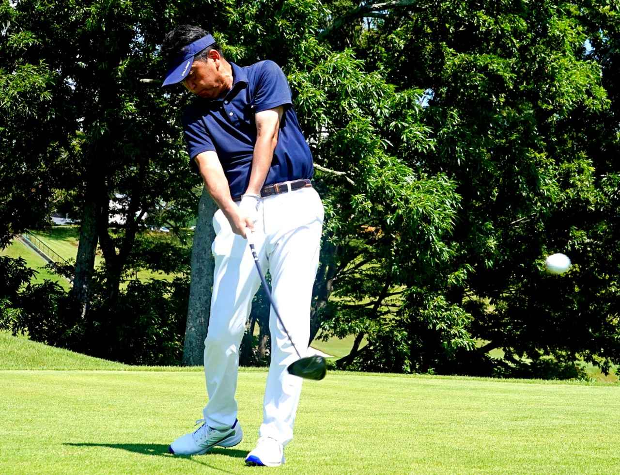 原田 右わきを締めるというのは、右ひじを右わき腹の近くにつけながらクラブを下ろしていくという動きです。そのとき、その意識が強過ぎると、左わきが空いて、クラブが寝て下りるような動きになってしまいます。