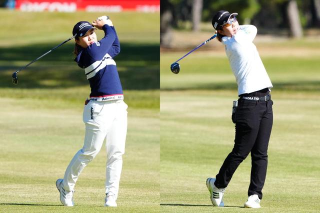 「JLPGAツアー選手権リコー杯」の2日目を67でプレーし首位に立った穴井詩(右)とイーブンパー13位で終えた畑岡奈紗(左)