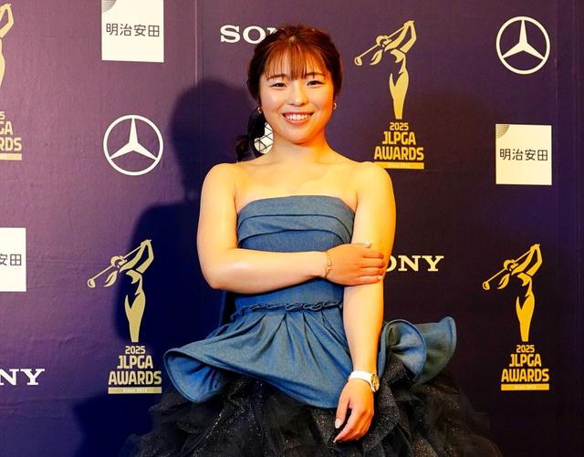 今季4勝を挙げ、「年間最優秀選手賞」「賞金ランキング第1位」「平均ストローク第1位」の3冠に輝いた佐久間朱莉。女王らしいドレスアップ姿で登壇した。