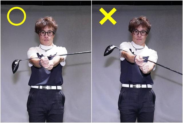 「もちろんアドレスが変わっただけでスライスが止まる人はいますが、もちろん止まらない人もいます。そんな人の多くはテークバックで体が回っていないことがほとんどです。なぜ回らないかといえば、手でクラブを引き上げるから。手で上げる人はテークバックで左腕が胸にくっついて腕が胸を潰すような格好になったり、逆に手が体から離れる人もいますが、そのいずれも左肩が入りません。これに対して体が回っている人は、アドレス時の両腕と胸の位置関係が変わらず肩もしっかり回る。後方から見たときに手元と体の間に隙間がありません(手元が内、クラブヘッドが外の位置関係が保たれている)。こうなるとクラブフェースがボールを見続けるテークバックになります。手で上げていた人がやるとかなり窮屈に感じるかもしれませんが、それが正解。窮屈な感じがないと体が回っていないと思ってください」