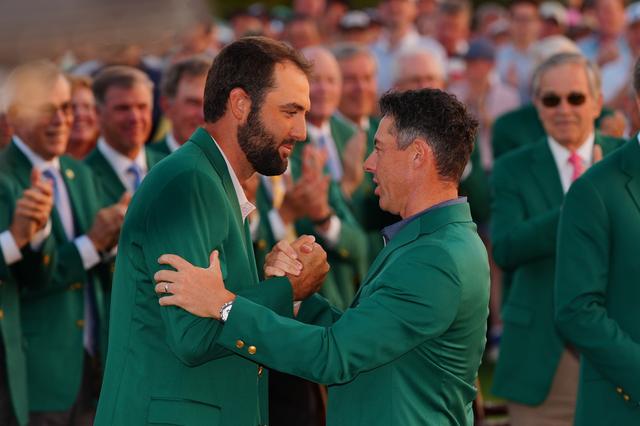 25年マスターズでグランドスラムを達成したマキロイ(右)は前年優勝のシェフラー(左)からグリーンジャケットを着せてもらった(撮影/岩本芳弘)