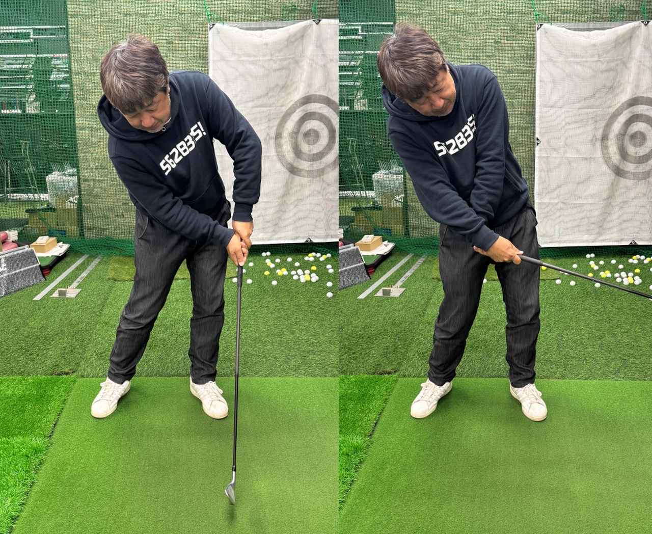 右手がシャフトに触るくらい短く持ちボールを打つ。前傾キープの感覚もわかる
