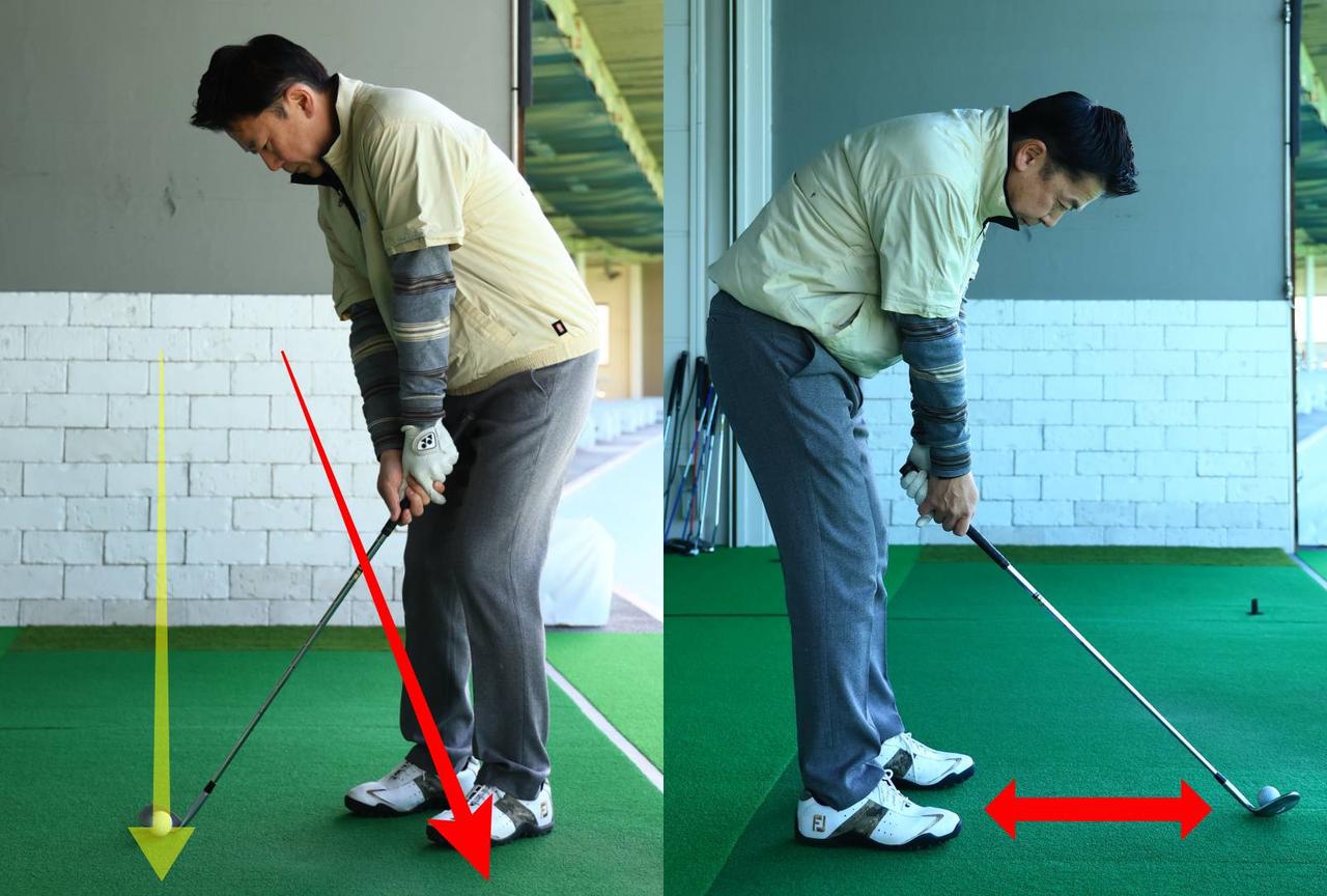 ボールが遠いとヘッドがプレーン下のダフリゾーンを通りやすく上体が起きるとトップも出る