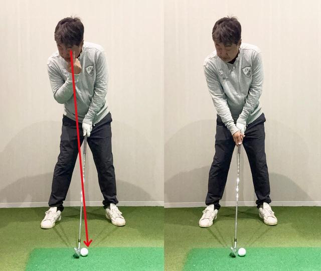 画像: 右目が利き目の人は右目でボールを真上から見る感じになる。ややハンドファースト強めのアドレスになる