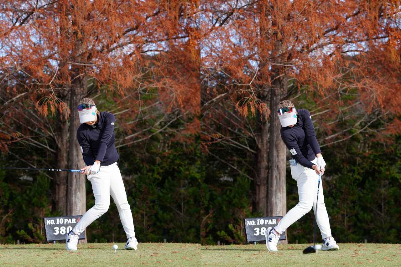 右軸のまま骨盤をしっかりとターンさせ、インパクトではおへそがターゲットを向くくらいまで回し込んでいます。その分バンドファーストが強く、ボールを押し込むような分厚いインパクトとなり大きな飛距離を実現しています。