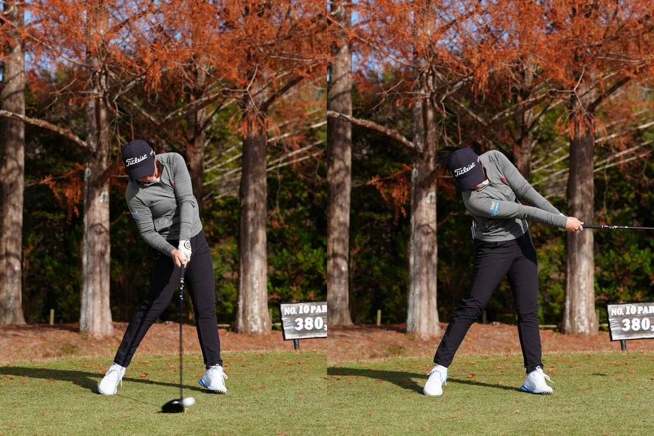 インパクト前後で右足をしっかりと踏み込んでいることが見て取れますが、これも上半身をしっかりターンさせるため。こうしたキネマティックシークエンスの安定には、「急ぎすぎず、テンポの良いスウィングを心がけている」という言葉通り、ラウンド中にテンポを意識することがとても効果的です。