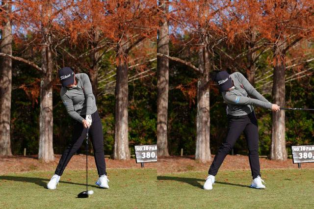 「飛ぶ方ではないのでフェアウェイキープを重視している」という言葉からも、海外での豊富な試合経験から培った、様々なコースに対応する能力の高さが見えてきます。オーソドックスなスクエアグリップで握り、センターに軸をキープしてテークバックしていきます。