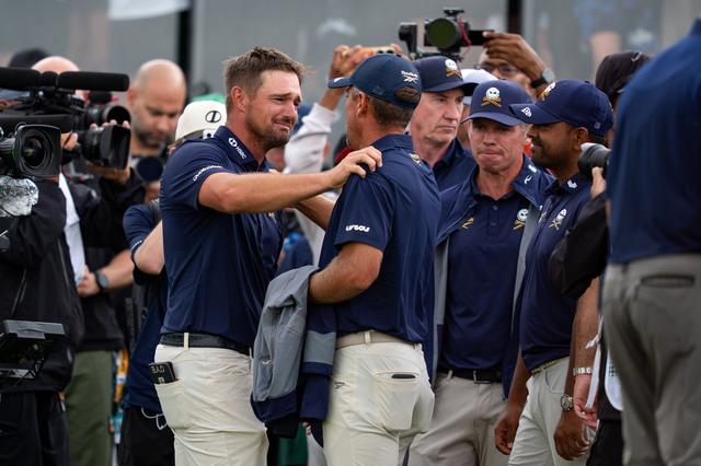 画像: 涙ぐみながらチームメイトと優勝を分かち合うデシャンボー(提供/LIVゴルフ)