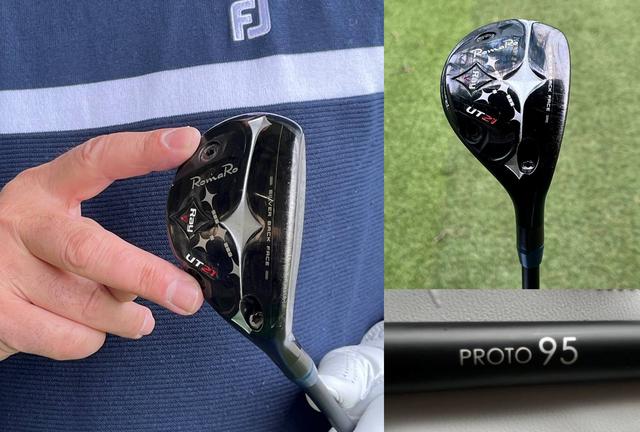 「今回試打するのは、ロマロの『Ray V-V1 UT(21度/3番相当)』と、マットブラックの質感に無刻印という、どこか謎めいた佇まいのシャフト『PROTO95』の組み合わせです。ロマロは当企画でも屈指の人気ブランドですが、今回のヘッドは2020年の発売以来、熱心なユーザーから今なお絶大な支持を集めている名器と聞き、期待が高まります。ヘッド形状はやや小ぶりで、アイアンの延長線上でラインを出すイメージが湧きやすいフォルムです。FP値(フェースプログレッション)が大きく、刃が出ているため球を拾いやすそうな安心感がありますね。ロフトは21度ですが、アドレスではしっかりとフェース面が見えるため難しさを感じさせない視覚的な工夫も光ります。一方、シャフトは中央に『PROTO95』と刻まれているのみの、極めてストイックで精悍なデザインです。一見してブランドが特定できないこのミステリアスな外観は、自分だけの『特別な1本』を手にしているような高揚感を与えてくれます。ラインナップを調べるとパターからアイアン用(75g台〜130g)まで幅広く、今回のユーティリティ・ショートウッド用は、特につかまりの良さを重視した設計とのことです」