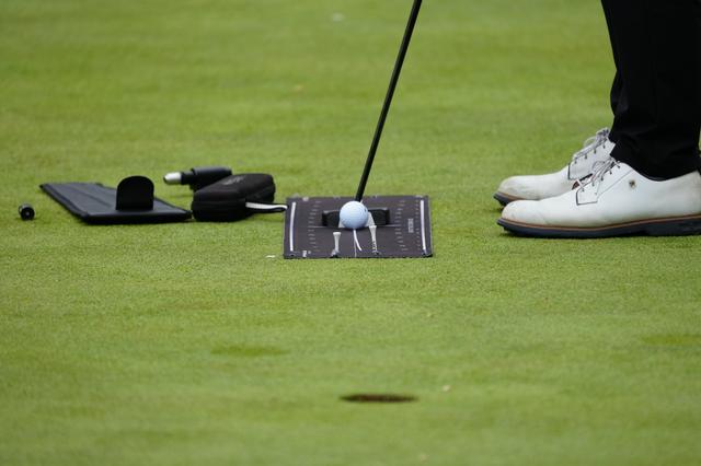 そのステーションやパッティングテンプレートは、傾斜計を使って左右の傾斜が0%の真っすぐのラインを探すところからスタートし、テンプレートと呼ばれるストローク中のヘッドの動きが印刷されたマットを置き、カップやターゲットに向けてストロークします。イン・トゥ・インのストロークだけでなくボール位置や目線、打ち出し方向などのチェックも同時にできるテンプレートを使った練習は、多くの選手が取り入れています。
