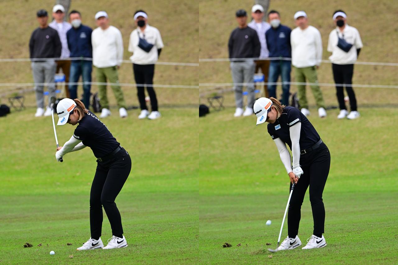 左手を少しかぶせたストロンググリップで握っているので、インパクトでの左手首には甲側に少し角度が保たれています。ウィークやスクエアグリップだとターゲット方向を向きますがストロンググリップであればアドレスした左甲の向きが正確です。オフに徹底的に練習したウェッジは、自分にマッチしたグリップとフェースコントロールに磨きをかけてきた成果が優勝争いの中でしっかりと結果として表れていました。