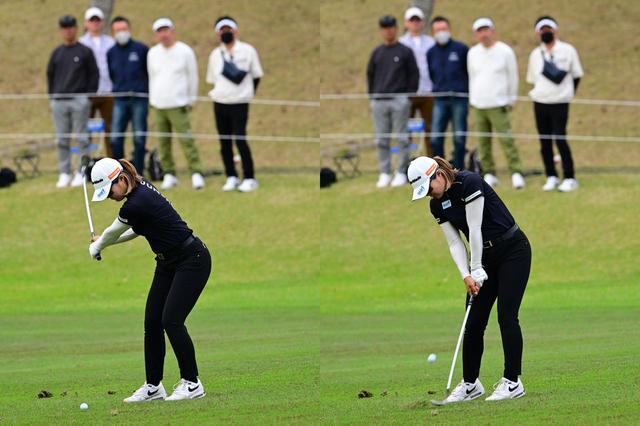 オフの取り組みや普段のトレーニングの積み重ねがスウィングにも表れています。アドレスでは真っすぐに伸びた背中や手元を高い位置に上げたトップでもぐらつかない下半身は、強風の中で安定感を発揮していました。