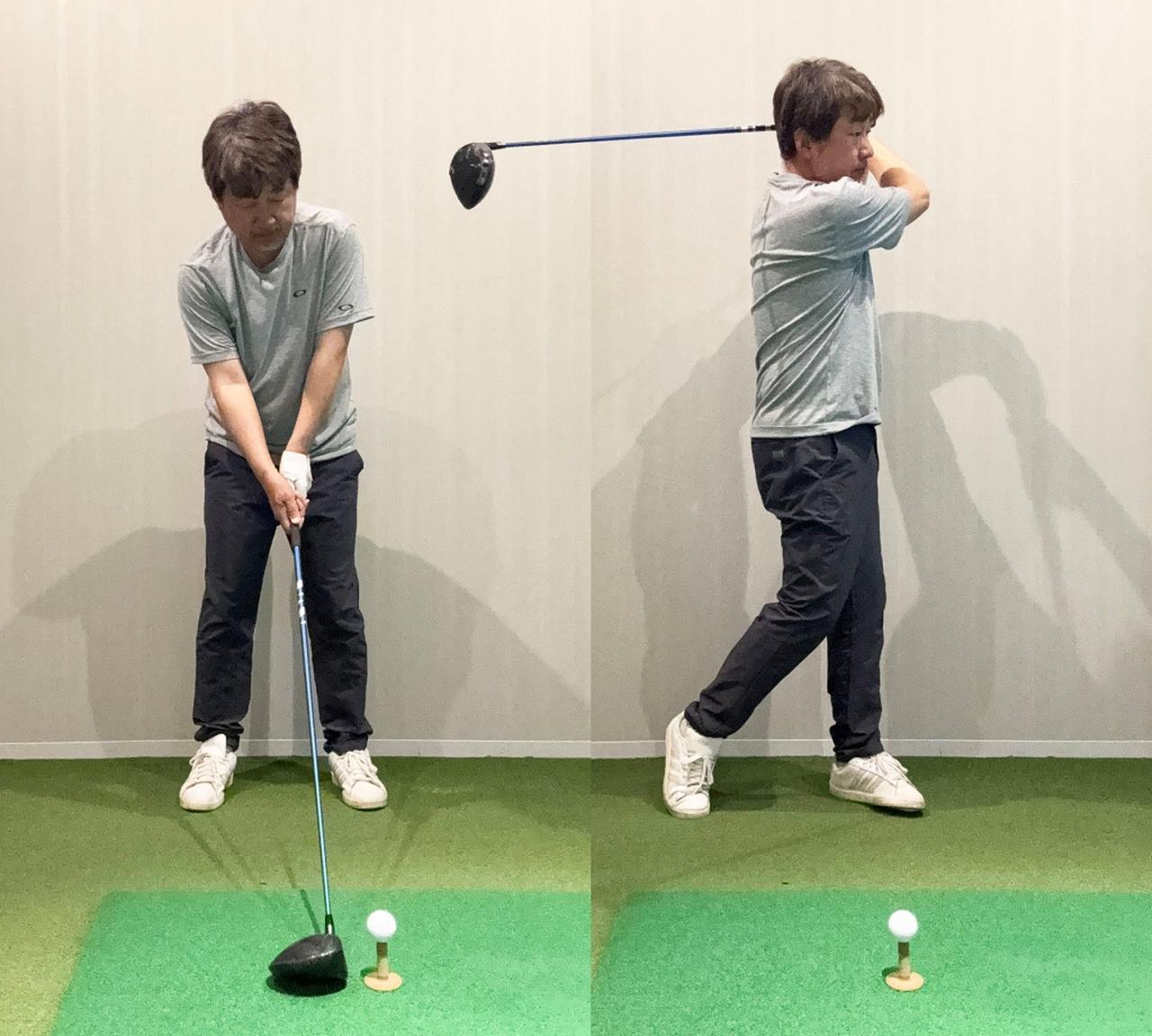 次に左足を開いてボールを打ってみました。これは普段のスタンスに近いので違和感がありません。股関節が硬くても、このスタンスだと気持ちよくフォローまで振り切ることができます。ただ自由に動きすぎるところがあるので、軌道が少し安定しない感覚はありますね。体が先に回転しすぎて振り遅れてしまうこともあります。