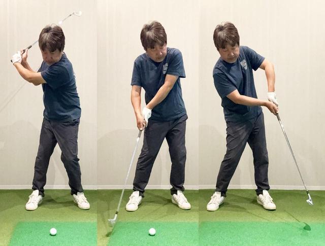 画像: ボールに当てたいという気持ちから右手首を早くリリースしてしまう。ヘッドが早く落ちてダフリを回避するために左ひじを引いたフォローになる