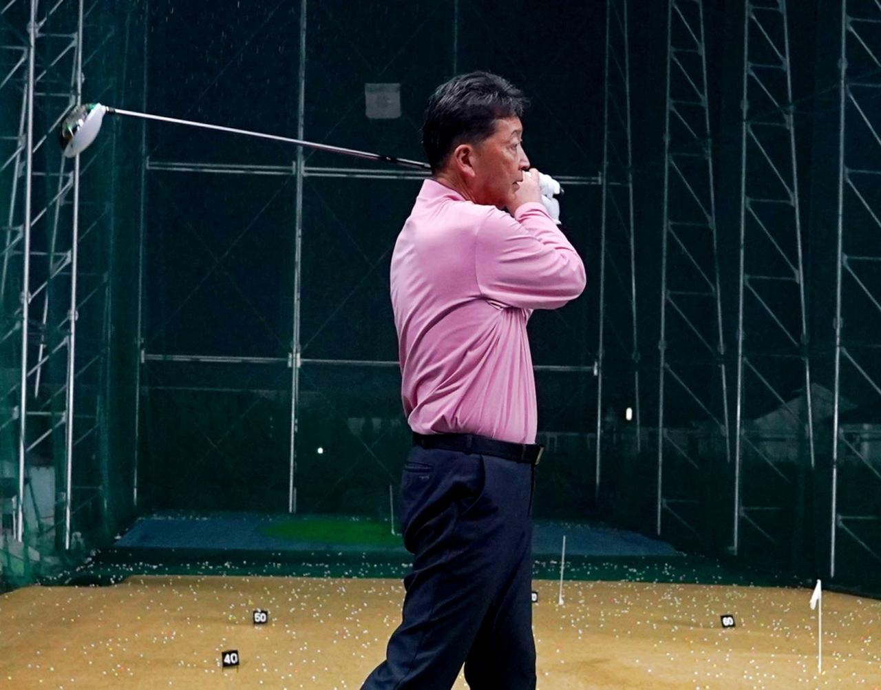 GD 一般的な大人の体形であれば、15センチぐらい右に頭が動くのが正しいのですね。自分はスウィング中に頭はなるべく動かさないのがいいと思っていたんですけど、実際に頭を固定する感じでテークバックをすると窮屈というかしっかり右に体重が乗せられない気がしていましたが、目の前の曇りが晴れた気がします。もう少し突っ込んで聞かせていただきますが、アイアンとドライバーではその右へ動く15センチぐらいは違いがあるのですか?